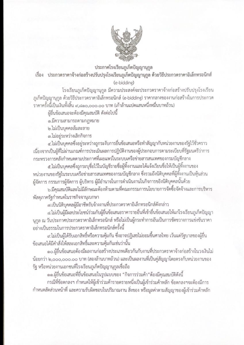 ประกวดราคาจ้างก่อสร้างปรับปรุงโรงเรียนภูเก็ตปัญญานุกูล ด้วยวิธีประกวดราคาอิเล็กทรอนิกส์ (e-bidding)