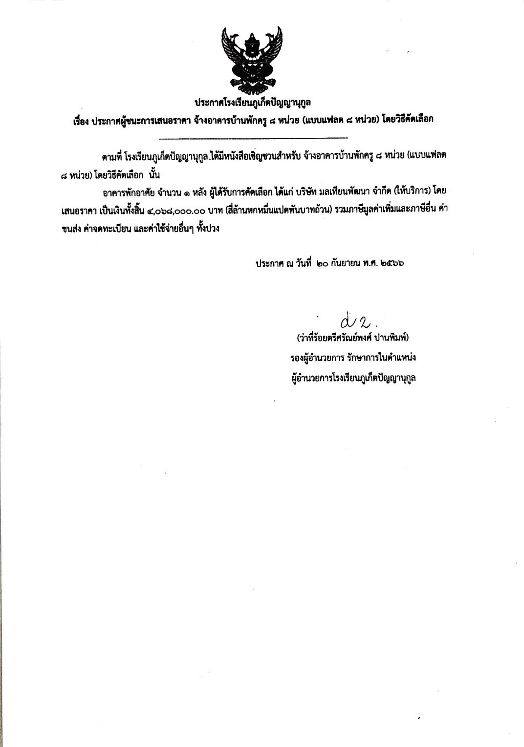 ประกาศผู้ชนะการเสนอราคา จ้างอาคารบ้านพักครู ๘ หน่วย (แบบแฟลต ๘ หน่วย) โดยวิธีเลือก