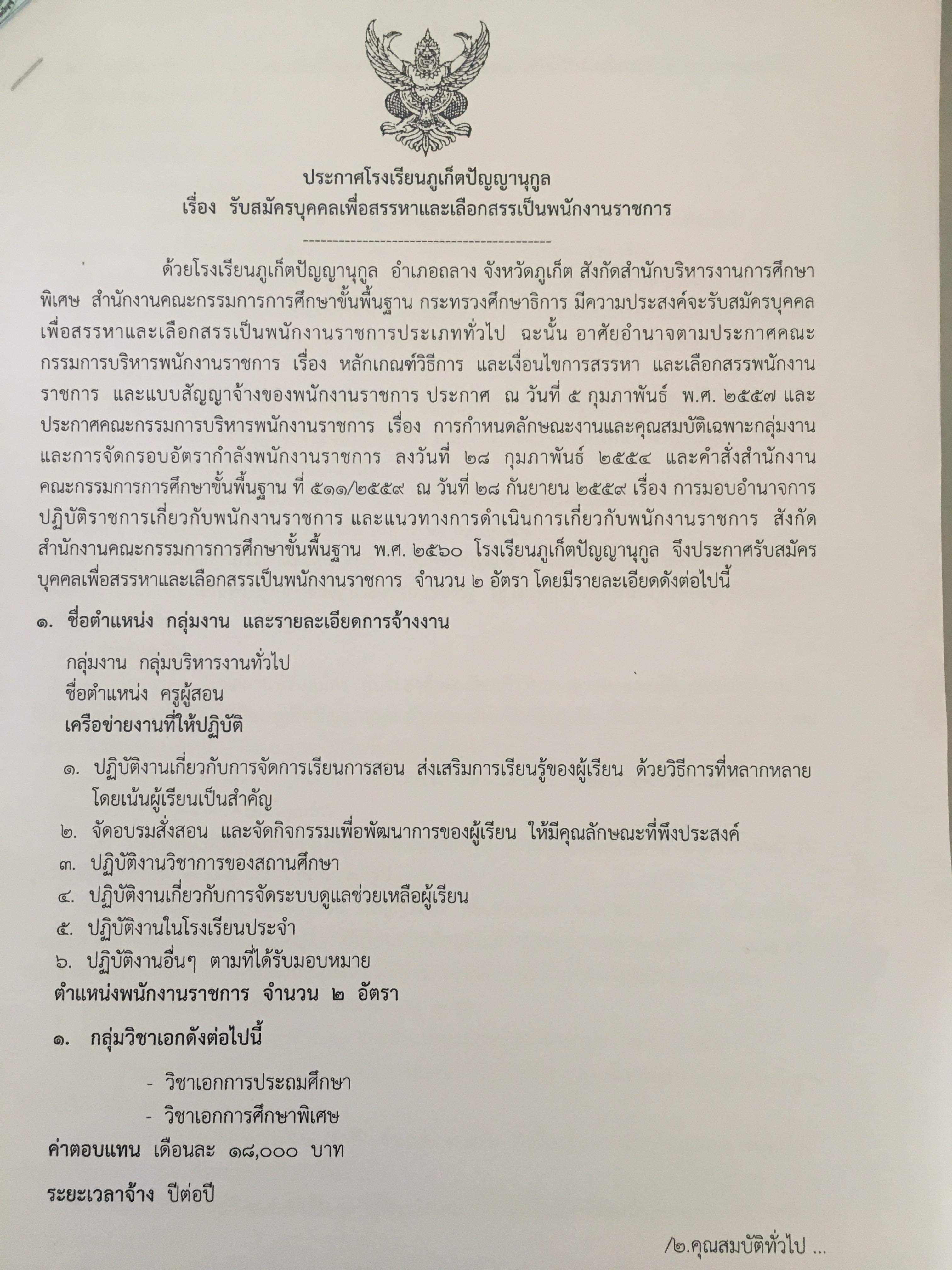 https://m.facebook.com/story.php?story_fbid=2522503014529585&id=100003097346517 โรงเรียนภูเก็ตปัญญานุกูล ประกาศสอบพนักงานราชการตำแหน่งครูผู้สอน จำนวน ๒ อัตรา -วิชาเอกการประถมศึกษา -วิชาเอกการศึกษาพิเศษ สามารถยื่นใบสมัครด้วยตนเองที่โรงเรียนภูเก็ตปัญญานุกูล ตั้งแต่วันที่ ๒๔-๒๙ ตุลาคม ๒๕๖๒ เวลา ๐๙.๐๐ น. - ๑๖.๐๐ น. ไม่เว้นวันหยุดราชการ ประกาศผู้มีสิทธิ์สอบเข้าคัดเลือกเป็นพนักงานราชการภายในวันที่ ๒๙ ตุลาคม ๒๕๖๒ และ ทำการสอบคัดเลือกในวันที่ ๓๐ ตุลาคม ๒๕๖๒ เวลา ๐๙.๐๐ น. ณ โรงเรียนภูเก็ตปัญญานุกูล คุณสมบัติผู้สมัคร และ เอกสารการสมัคร ตามแนบประกาศ ติดต่อสอบถามทางโทรศัพท์ได้ที่หมายเลข ๐๘๑-๗๗๘-๙๒๐๗,๐๘๑-๗๓๒-๙๒๗