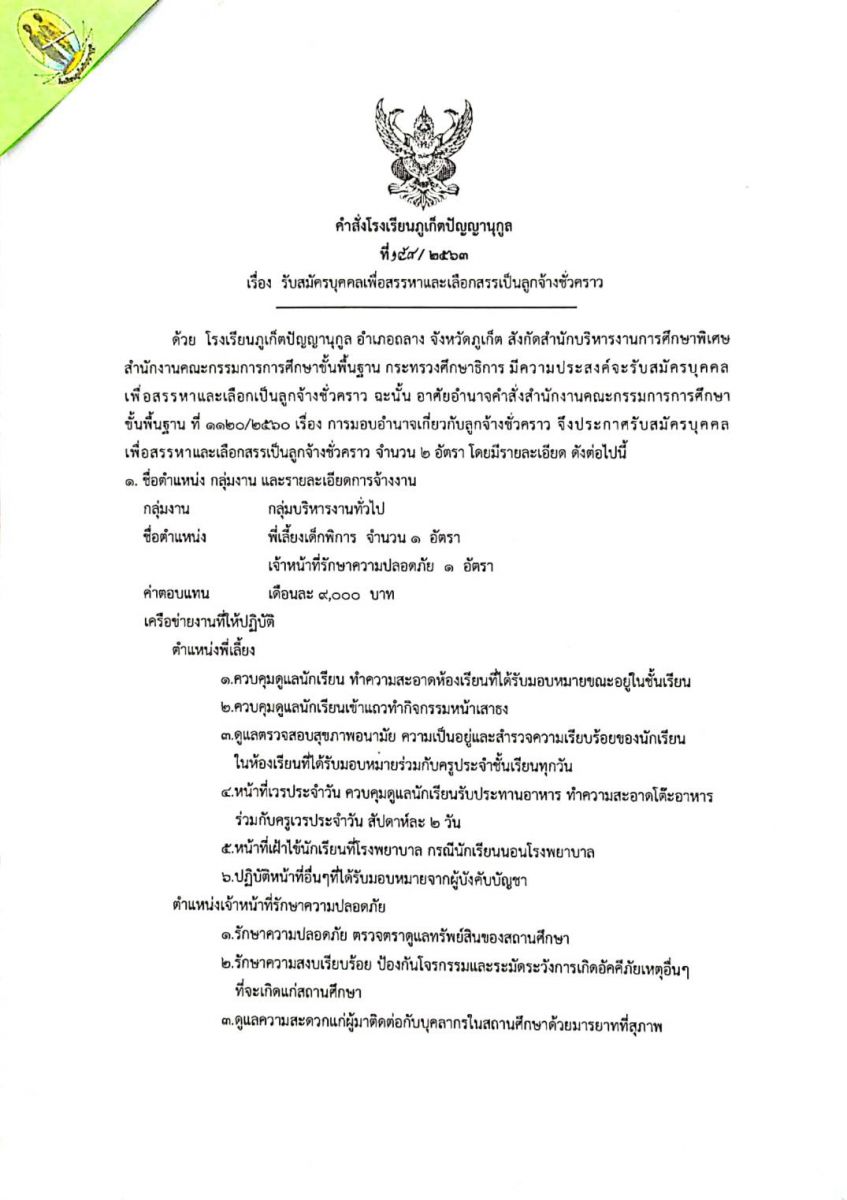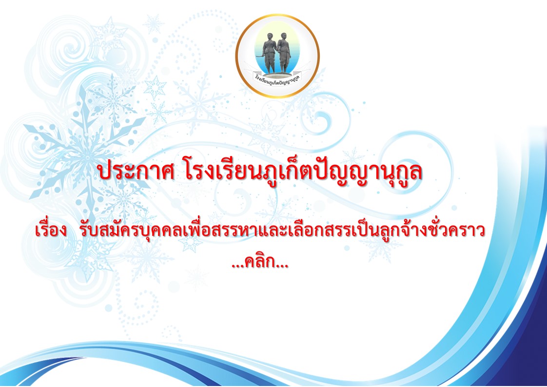 ประกาศ โรงเรียนภูเก็ตปัญญานุกูล เรื่อง รับสมัครบุคคลเพื่อสรรหาและเลือกสรรเป็นลูกจ้างชั่วคราว