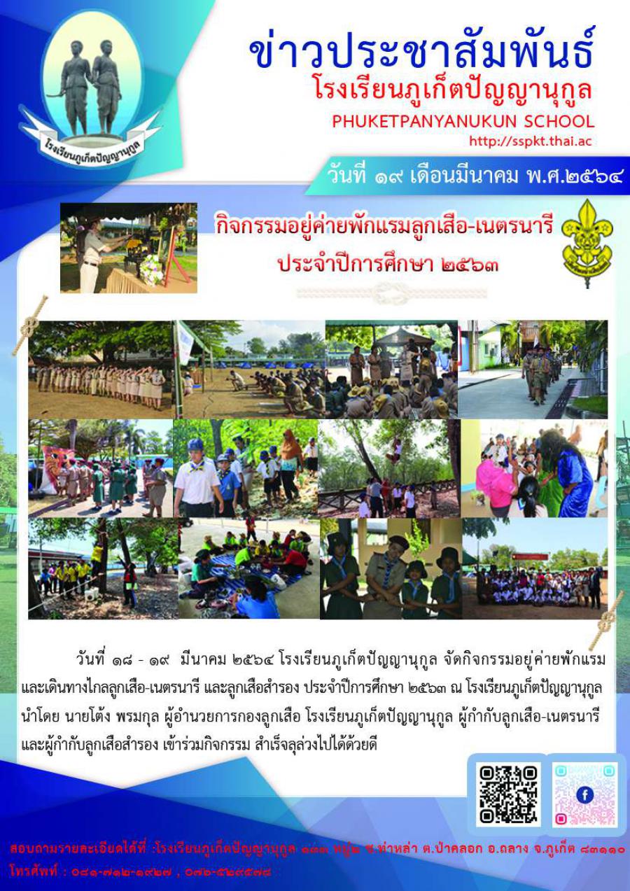 วันที่ ๑๘ - ๑๙  มีนาคม ๒๕๖๔ โรงเรียนภูเก็ตปัญญานุกูล จัดกิจกรรมอยู่ค่ายพักแรม และเดินทางไกลลูกเสือ-เนตรนารี และลูกเสือสำรอง ประจำปีการศึกษา ๒๕๖๓ ณ โรงเรียนภูเก็ตปัญญานุกูล นำโดย นายโต้ง พรมกุล ผู้อำนวยการกองลูกเสือ โรงเรียนภูเก็ตปัญญานุกูล ผู้กำกับลูกเสือ-เนตรนารี และผู้กำกับลูกเสือสำรอง เข้าร่วมกิจกรรม สำเร็จลุล่วงไปได้ด้วยดี