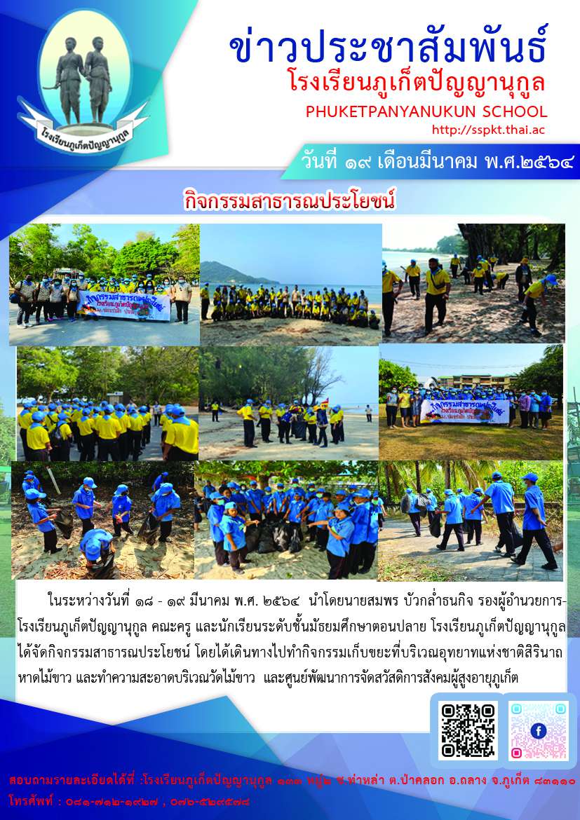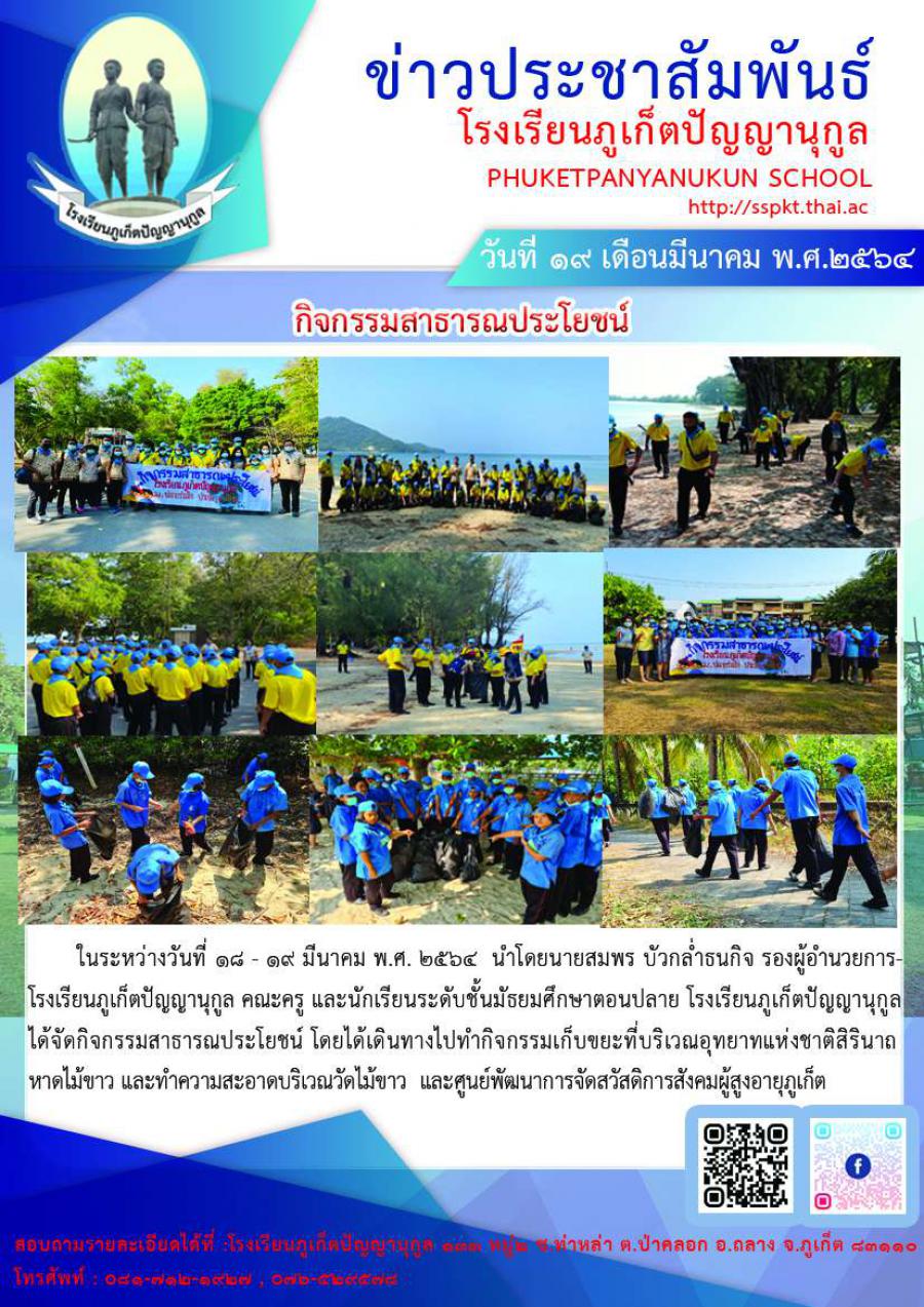 ในระหว่างวันที่ ๑๘ - ๑๙ มีนาคม พ.ศ. ๒๕๖๔  นำโดยนายสมพร บัวกล่ำธนกิจ รองผู้อำนวยการ- โรงเรียนภูเก็ตปัญญานุกูล คณะครู และนักเรียนระดับชั้นมัธยมศึกษาตอนปลาย โรงเรียนภูเก็ตปัญญานุกูล ได้จัดกิจกรรมสาธารณประโยชน์ โดยได้เดินทางไปทำกิจกรรมเก็บขยะที่บริเวณอุทยาทแห่งชาติสิรินาถ  หาดไม้ขาว และทำความสะอาดบริเวณวัดไม้ขาว  และศูนย์พัฒนาการจัดสวัสดิการสังคมผู้สูงอายุภูเก็ต จังหวัดภูเก็ต
