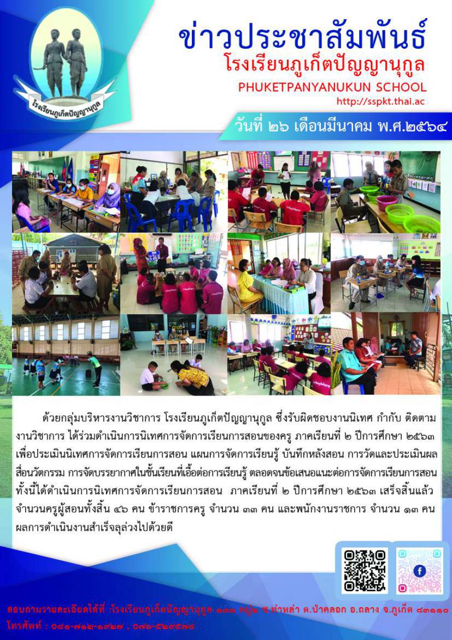 ด้วยกลุ่มบริหารงานวิชาการ โรงเรียนภูเก็ตปัญญานุกูล ซึ่งรับผิดชอบงานนิเทศ กำกับ ติดตาม งานวิชาการ ได้ร่วมดำเนินการนิเทศการจัดการเรียนการสอนของครู ภาคเรียนที่ ๒ ปีการศึกษา ๒๕๖๓ เพื่อประเมินนิเทศการจัดการเรียนการสอน แผนการจัดการเรียนรู้ บันทึกหลังสอน การวัดและประเมินผล สื่อนวัตกรรม การจัดบรรยากาศในชั้นเรียนที่เอื้อต่อการเรียนรู้ ตลอดจนข้อเสนอแนะต่อการจัดการเรียนการสอน ทั้งนี้ได้ดำเนินการนิเทศการจัดการเรียนการสอน ภาคเรียนที่ ๒ ปีการศึกษา ๒๕๖๓ เสร็จสิ้นแล้ว จำนวนครูผู้สอนทั้งสิ้น ๔๖ คน ข้าราชการครู จำนวน ๓๓ คน และพนักงานราชการ จำนวน ๑๓ คน ผลการดำเนินงานสำเร็จลุล่วงไปด้วยดี