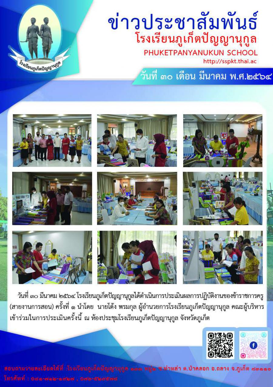 วันที่ ๓๐ มีนาคม ๒๕๖๔ โรงเรียนภูเก็ตปัญญานุกูลได้ดำเนินการประเมินผลการปฏิบัติงานของข้าราชการครู (สายงานการสอน) ครั้งที่ ๑ นำโดย  นายโต้ง พรมกุล ผู้อำนวยการโรงเรียนภูเก็ตปัญญานุกูล คณะผู้บริหาร หัวหน้าฝ่ายงานเข้าร่วม ในการประเมินครั้งนี้ ณ ห้องประชุมโรงเรียนภูเก็ตปัญญานุกูล จังหวัดภูเก็ต