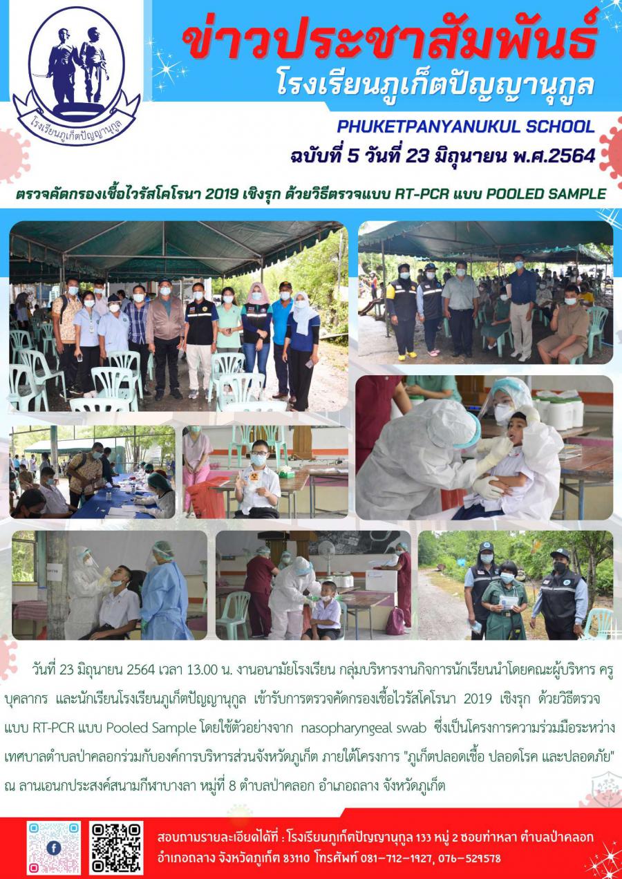 วันที่ 23 มิถุนายน 2564 เวลา 13.00 น. งานอนามัยโรงเรียน กลุ่มบริหารงานกิจการนักเรียนนำโดยคณะผู้บริหาร ครู บุคลากร และนักเรียนโรงเรียนภูเก็ตปัญญานุกูล เข้ารับการตรวจคัดกรองเชื้อไวรัสโคโรนา 2019 เชิงรุก ด้วยวิธีตรวจแบบ RT-PCR แบบ Pooled Sample โดยใช้ตัวอย่างจาก nasopharyngeal swab ซึ่งเป็นโครงการความร่วมมือระหว่าง เทศบาลตำบลป่าคลอกร่วมกับองค์การบริหารส่วนจังหวัดภูเก็ต ภายใต้โครงการ "ภูเก็ตปลอดเชื้อ ปลอดโรค และปลอดภัย" ณ ลานเอนกประสงค์สนามกีฬาบางลา หมู่ที่ 8 ตำบลป่าคลอก อำเภอถลาง จังหวัดภูเก็ต